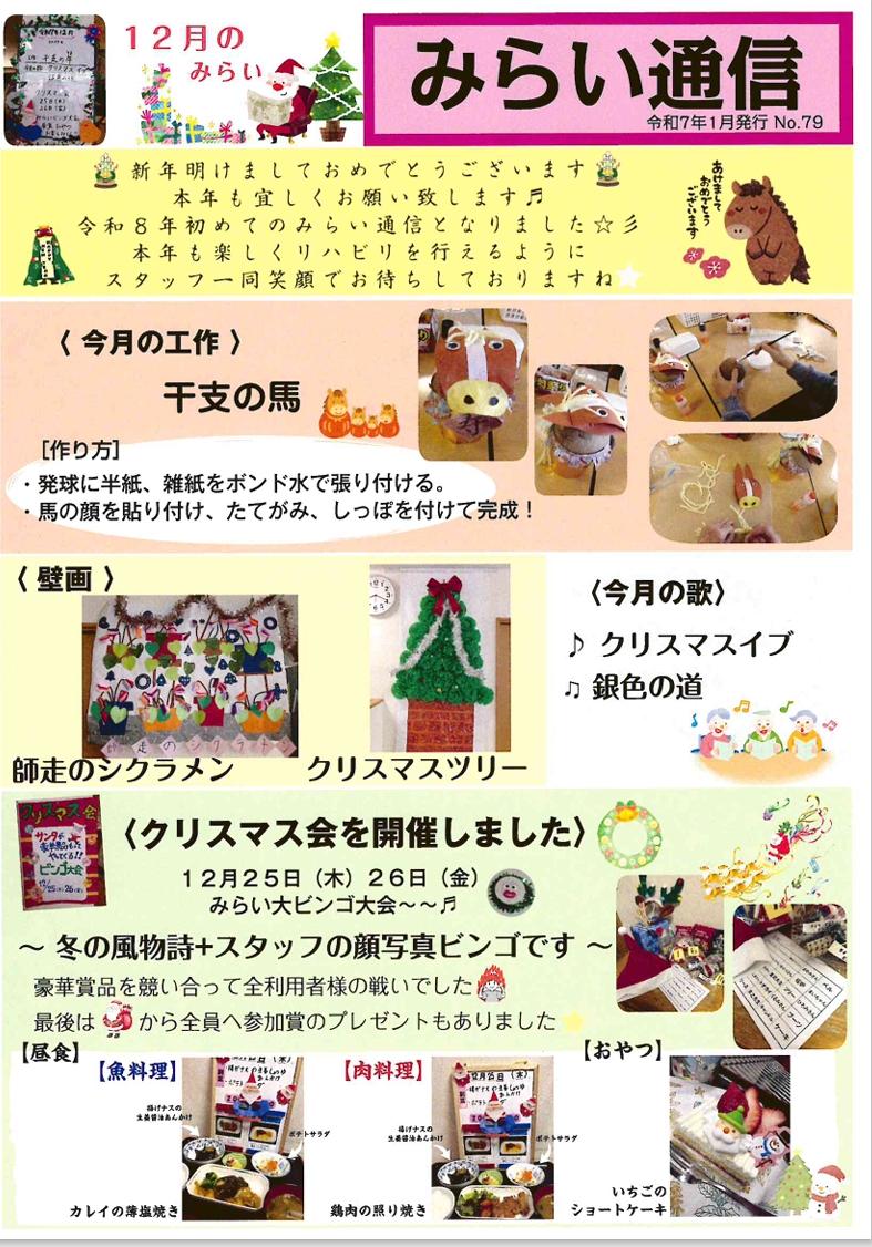 No79みらい通信・2026年1月号 2026年1月14日 最終更新日時 : 2026年1月14日 wpmaster 2026年1月令和8年初めてのみらい通信です。12月のクリスマス会の写真を載せました★美味しい昼食やおやつ★ビンゴ大会の様子 工作は今年の干支【午】を可愛く作りました(^^♪ Follow me! FacebookXHatenaPocketCopy